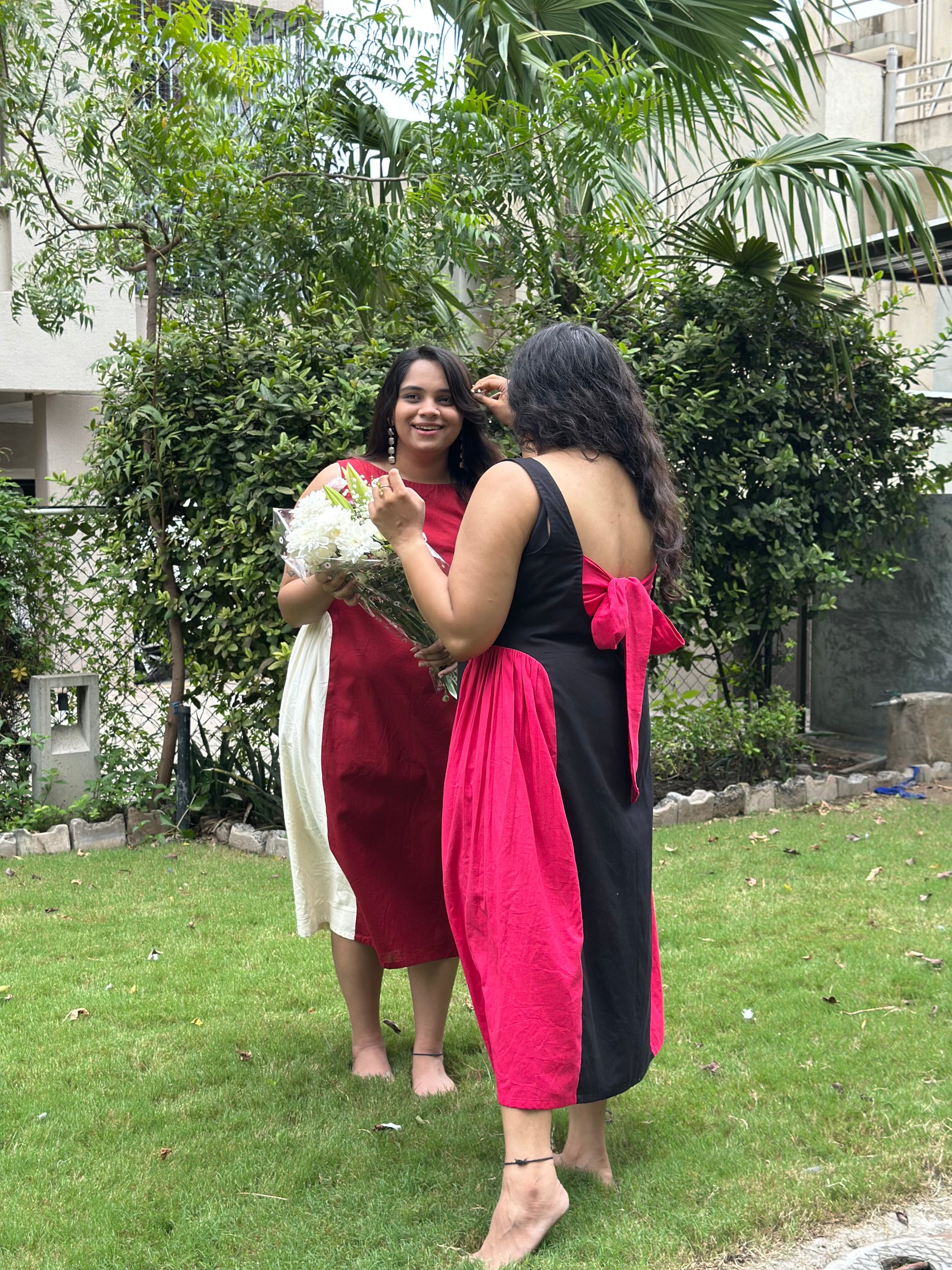a super chic dress with colour block. a deep back with bow detail. a classic silhouette for all your outings. made with 100% cotton.