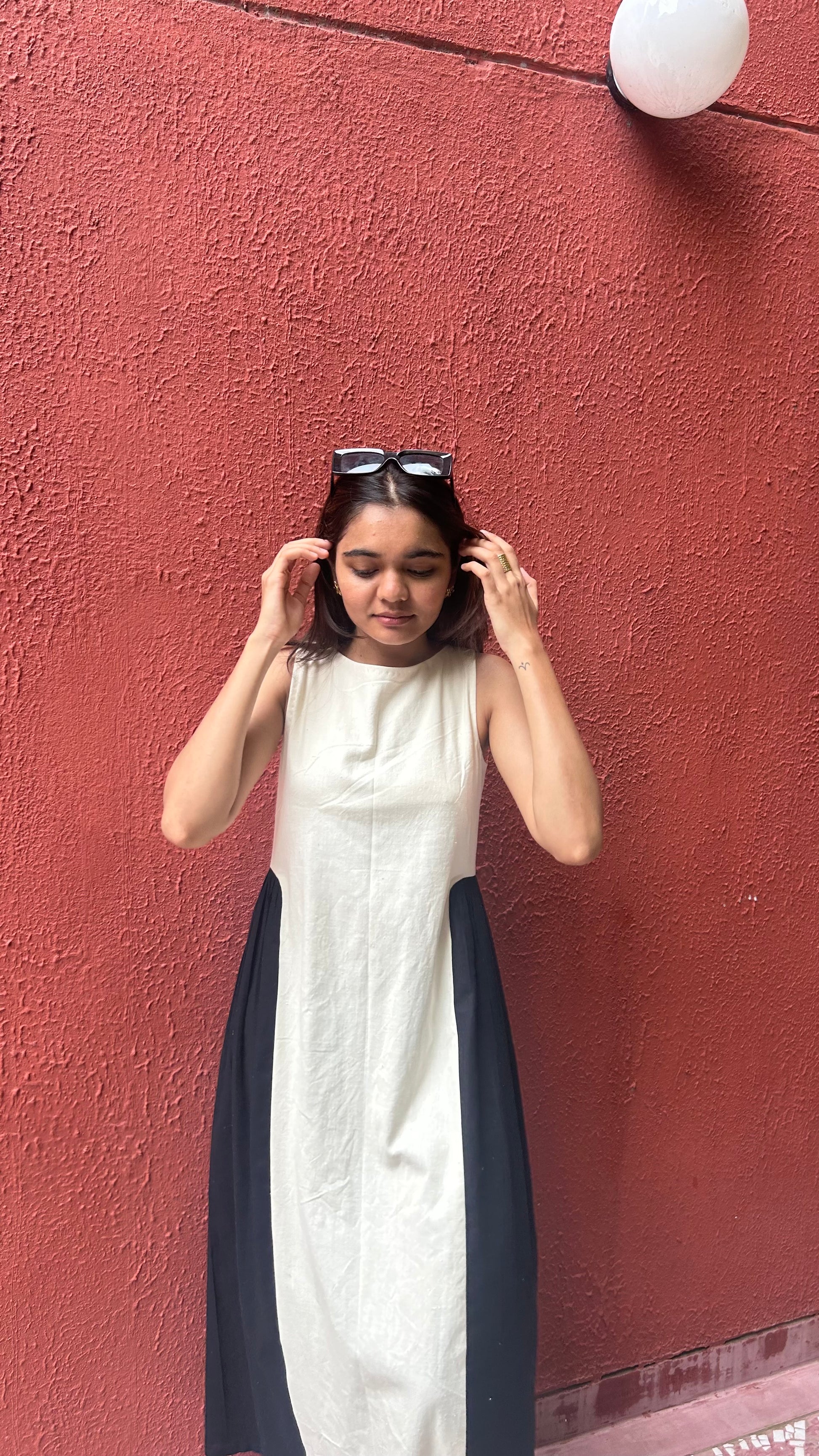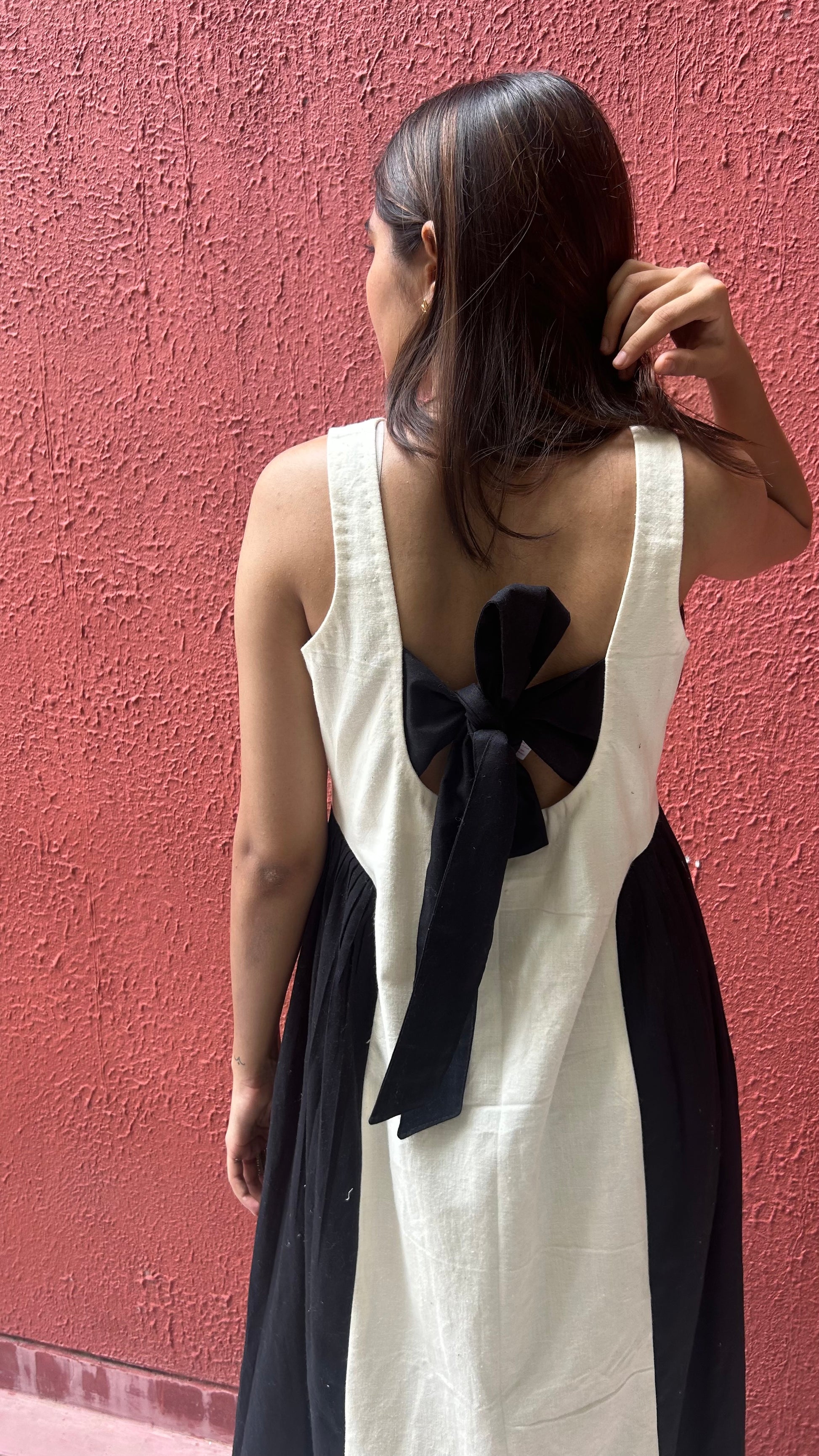 a super chic dress with colour block. a deep back with bow detail. a classic silhouette for all your outings. made with 100% cotton.