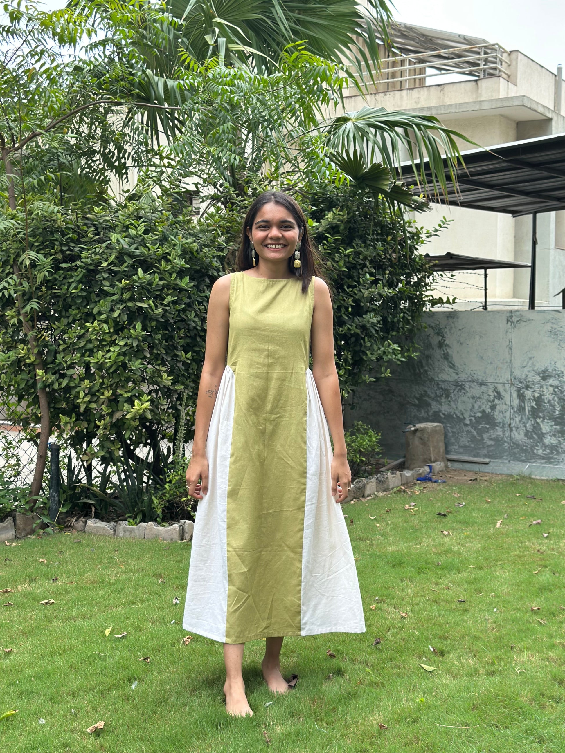 a super chic dress with colour block. a deep back with bow detail. a classi c silhouette for all your outings. made with 100% cotton.